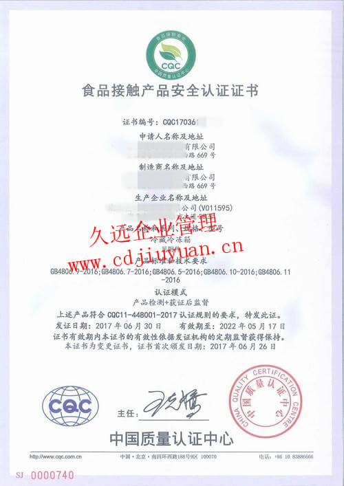 食品接觸產(chǎn)品安全認證證書